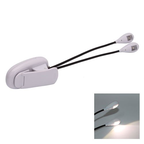 Dual Arm 2 Goosenecks, Introductions: Do you want to find a good-to-use LED music stand light when you play the piano or keyboard?If so, here we are willing to introduce this great Music Light to you. This high quality music stand light features fully adjustable lamp with dual goosenecks and Dual Super LED lights with separate switches, high-efficient and excellent for use. Besides, it is easy to use with clip-on or freestanding. The beams point any direction, even the light is with no hot spots. What an ideal music stand light, take the chance and don't miss out! Specifications: 1.Weight: 3.46 oz. 2.Color: white. 3.Material: plastic. Package included: 1 x Dual Arm 2 Goosenecks LED Music Stand Light Lamp White